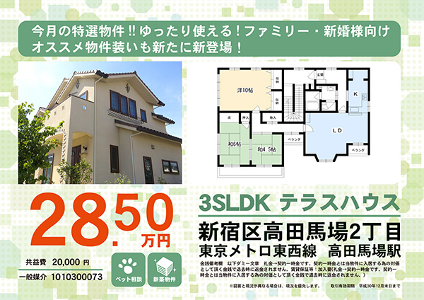 お勧めマークを大きく配置して、最寄り駅名を大きく表示した店頭専用チラシです。